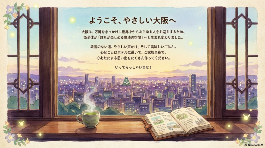 足腰に不安があるシニア世代や車椅子・松葉杖をご利用の方でも、移動負担が少ない立地やサポートが手厚い宿を選ぶことで、ご家族みんなで笑顔あふれる大阪観光が叶います。
